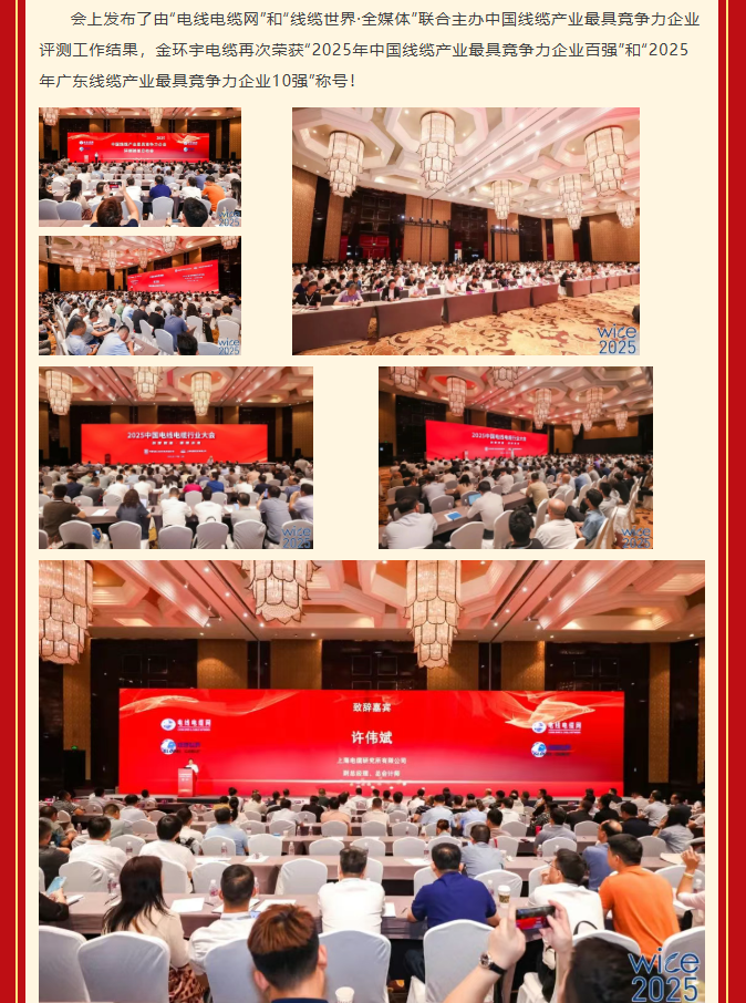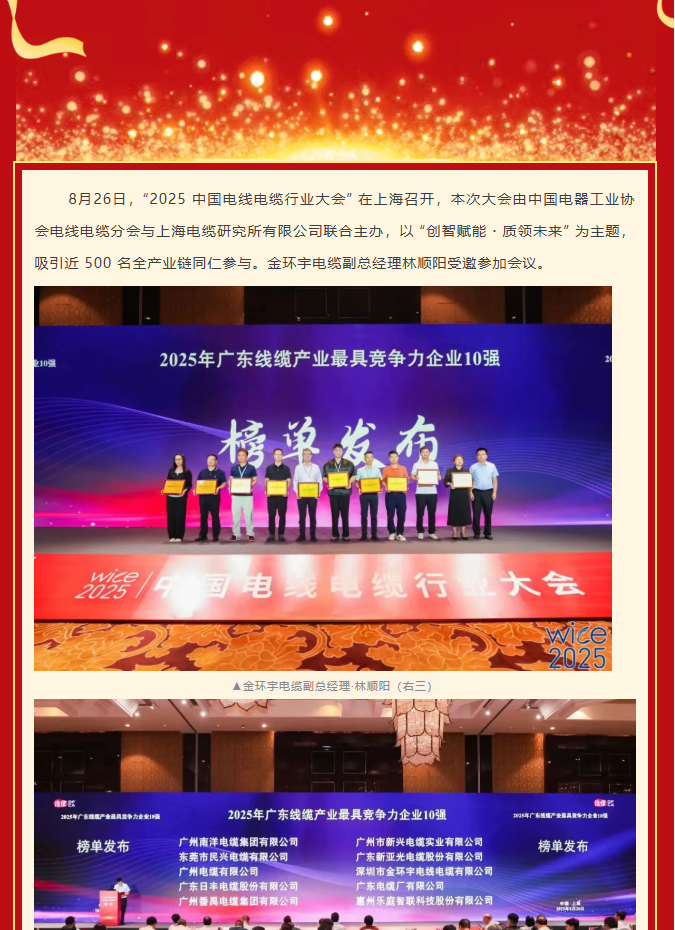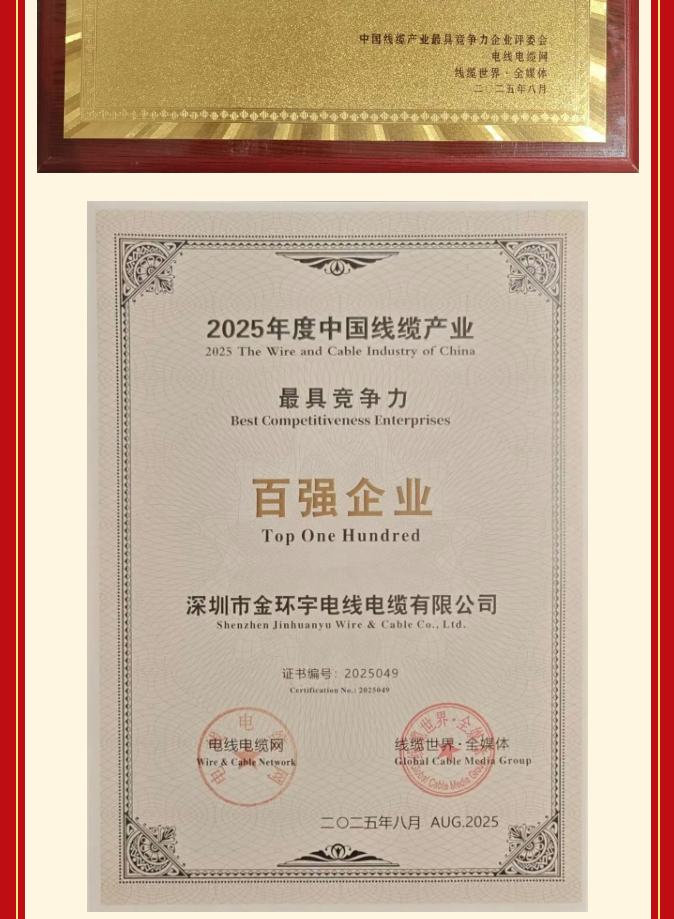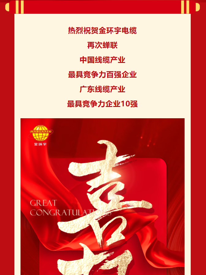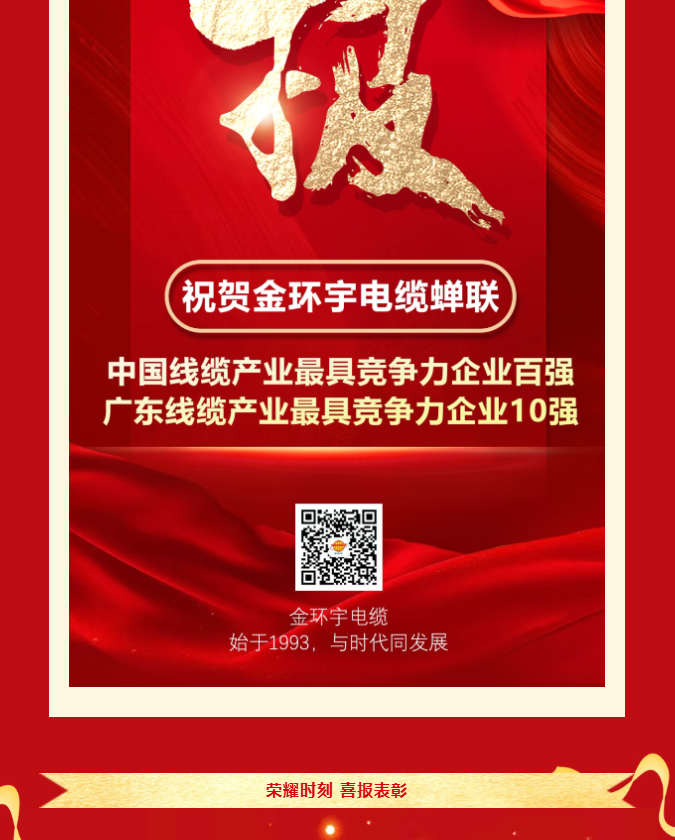 喜报丨热烈祝贺金环宇电缆再次蝉联中国线缆产业最具竞争力企业百强和广东线缆产业最具竞争力企业10强荣誉!